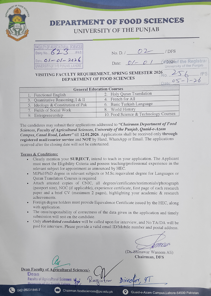 Job Type: Visiting Faculty Required for Spring 2026 (Department of Food Sciences) No. of Posts: Department: Department of Food Sciences