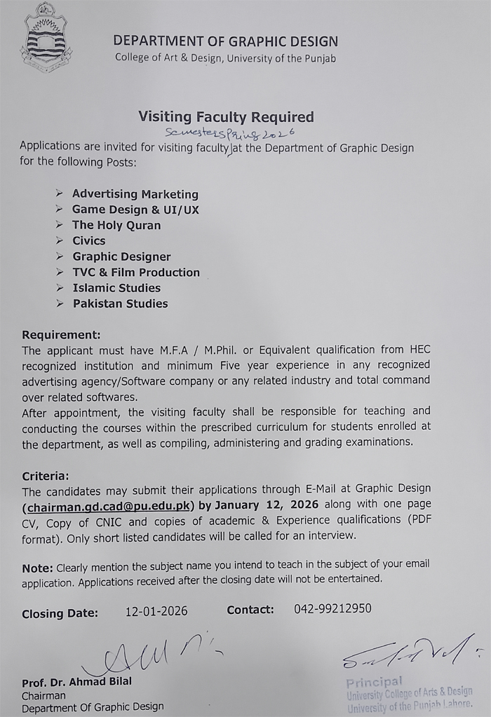 Job Type: Visiting Faculty Required for Spring 2026 (Department of Graphic Design) No. of Posts: Department: Department of Graphic Design