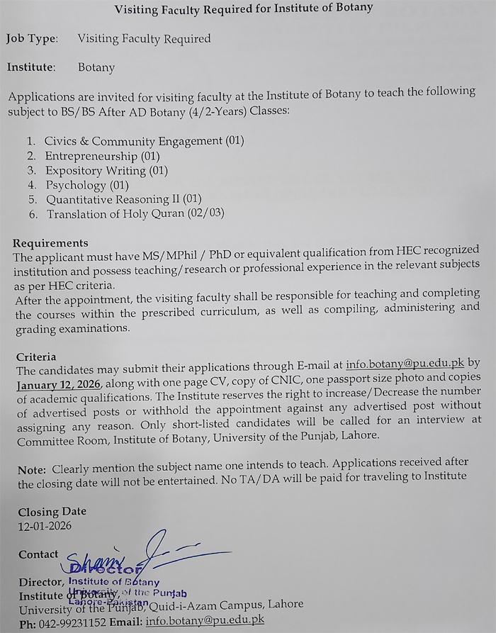 Job Type: Visiting Faculty Required for Spring 2026 (Institute of Botany) No. of Posts: Department: Institute of Botany